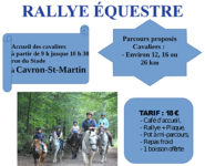 Cavron Saint Martin 62 RALLYE ÉQUESTRE Parcours proposés aux cavaliers : environ 12, 16 ou 26km. 10h30, rue du Stade. Tarif 18€. Infos & réservation :…