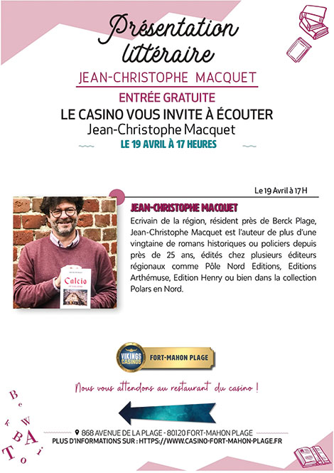 Écrivain de la région, résident près de Berck Plage, Jean-Christophe Macquet est l’auteur de plus d’une vingtaine de romans historiques ou policiers depuis près de 25 ans, édités chez plusieurs éditeurs régionaux comme Pôle Nord Éditions, Éditions Arthémuse, Édition henry ou bien dans la collection Polars en Nord.