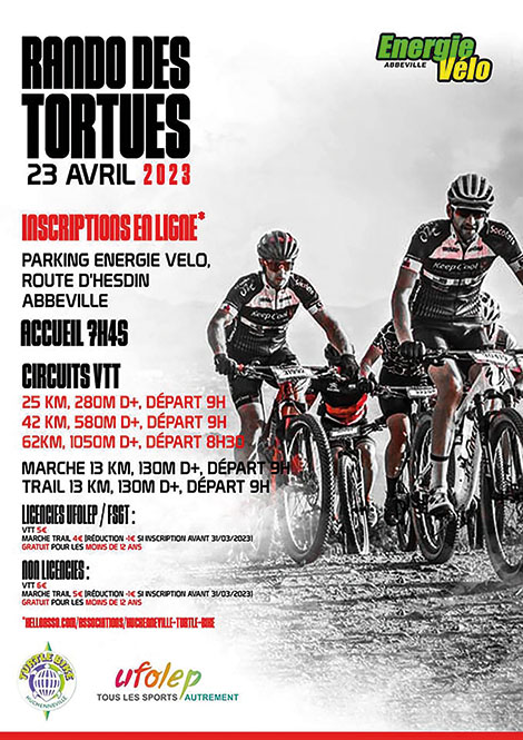Bienvenue aux randonneuses et aux randonneurs pour une petite boucle autour d’Abbeville sur un itinéraire aux paysages variés. Les vététistes auront le choix entre 3 parcours de difficulté croissante qui pourront être empruntés sur un rythme promenade ou plus engagé selon le niveau de pratique. Les amateurs de nature seront ravis des parcours proposés ! 3 parcours VTT (25km, 42km & 62km), un parcours Marche (13km) et un parcours Trail (13km). Nous offrons un petit café au départ pour vous réveiller avant de prendre le départ. Une petite collation sera proposée à l’arrivée après des efforts bien mérités ! Organisé par l’association Huchenneville Turltle Bike.