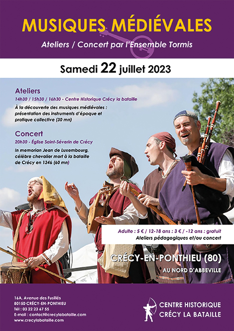 14h30, 15h30, 16h30, ATELIERS : présentation des instruments de musique du Moyen Âge, dans le Ponthieu du XIIIème au XIVème siècle et pratique collective.