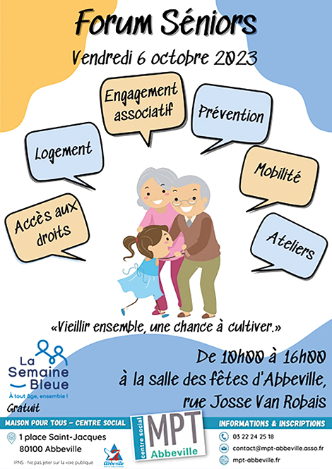 La MPT- Centre social met en place une semaine d’activités destinée aux séniors. Le forum du 6/10 qui sera le temps fort vise à réunir de nombreux partenaires œuvrant auprès des seniors pour leur apporter toutes informations les concernant et cela dans une ambiance conviviale et ludique. La Maison pour Tous – Centre Social Abbeville, vous accueille et vous propose, au cours de cette semaine, des activités gratuites en faveur des séniors. Lors de ce forum, vous trouverez de l’information, des ateliers, des animations ludiques et récréatives (musicales, bien-être…), ainsi qu’une tombola gratuite.