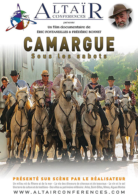 Organisé par Altaïr conférences, commenté en direct par ses réalisateurs. Film documentaire d’Éric Fontaneilles et Frédéric Bonnet. Dans ce film vous découvrirez une Camargue secrète vivant au rythme des éleveurs de chevaux et de taureaux. Sur cette terre de marées, survolée par les flamants roses, s’est développé un patrimoine et une culture uniques que vous révèlent ces deux cinéastes. La Camargue se survole, elle se traverse en voiture mais c’est à pied, dans les marais et les roselières, qu’elle se dévoile, avec l’accueil de ses moustiques, ses étés brûlants et son mistral en hiver. Une Camargue aux quatre saisons, secrète et fascinante !