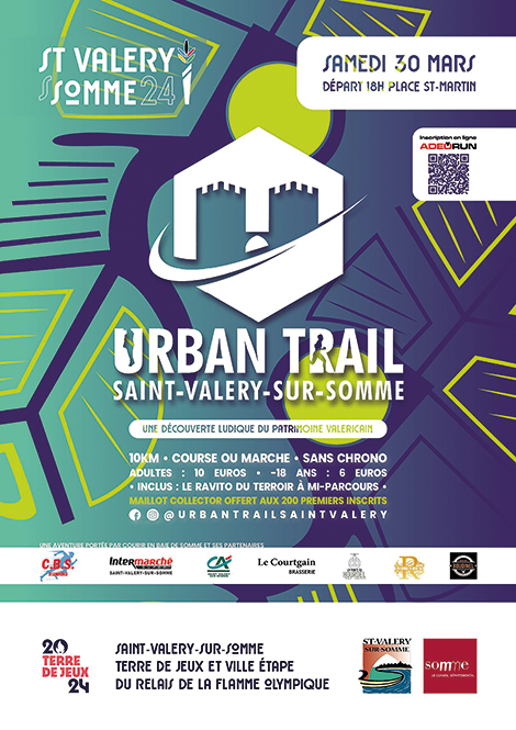 Organisé par le club « Courir en Baie de Somme ». Une découverte active et ludique du patrimoine valericain ! Pourquoi toujours vouloir sortir des sentiers battus ? Les rues, quais, monuments et panoramas valericains que vous pensez connaître par cœur vous réserventencore de belles surprises ! Différent d’un trail classique, l’Urban Trail est un défi accessible à tous qui conjugue activité physique (course ou marche) et découverte du patrimoine. Rendez-vous le samedi 30 mars pour redécouvrir au crépuscule les plus beaux bâtiments et points de vue de Saint-Valery-sur-Somme dans une ambiance conviviale et pleine d’énergie !