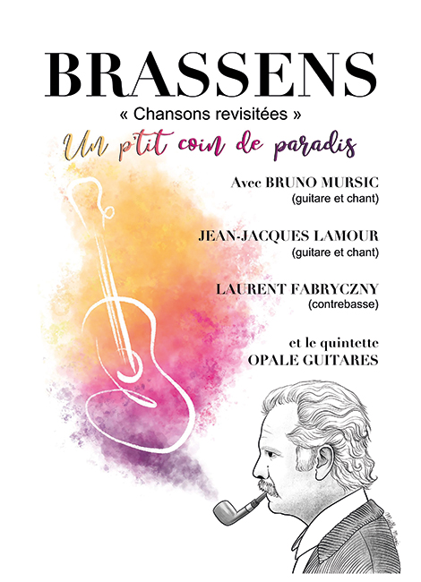 Georges BRASSENS aurait eu cent ans cette année, et quarante ans après sa disparition, ses chansons sont non seulement toujours présentes dans nos mémoires, mais les sujets abordés toujours d’actualité. La grande richesse poétique de ses textes et l’incroyable qualité de ses musiques continuent d’inspirer les musiciens d’aujourd’hui. Bruno MURSIC accompagné de ses amis chanteurs et le quintette « Opale guitares » se sont emparés d’une bonne trentaine de chansons de Brassens pour les revisiter, les arranger, les remanier en leur changeant souvent leur couleur musicale empruntée au jazz, à la bossa-nova ou au reggae.