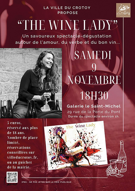 Attention opération spéciale, avec un rendez-vous inédit « un spectacle dégustation »… « The wine lady » propose une heure de spectacle à la fois tendre, savoureux, plein d’humour et de finesse autour de l’amour, du verbe et du bon vin… le tout ponctué de bons crus !