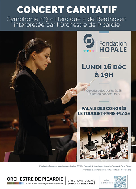 Concert de l’Orchestre de Picardie donné au profit de la Fondation Hopale, opérateur de santé de référence des Hauts-de-France, qui porte depuis plus d’un siècle un modèle de soin original tourné vers l’humain. Premier orchestre à avoir reçu le label «Orchestre national en région» en juillet 2018, l’Orchestre de Picardie est réputé pour son énergie et la vitalité de ses interprétations. Le temps d’une soirée, le Palais des Congrès vibrera au son de l’une des plus belles symphonies de l’histoire de la musique : la célèbre Symphonie N°3 de Ludwig Van Beethoven, Dite Symphonie “HÉROÏQUE”. Sous la baguette de la cheffe Johanna Malangré, l’une des rares femmes cheffe d’orchestre en France, nous vous invitons à découvrir ou redécouvrir ce monument de l’histoire de la musique. Au-delà de l’événement artistique, ce concert sera l’occasion de soutenir la Fondation Hopale, dans ses missions et projets au service d’une vie meilleure. En participant à ce concert, vous contribuez à valoriser les magnifiques récits de vie qui s’écrivent chaque jour au sein des établissements de santé Hopale tout en favorisant la résilience des patients.