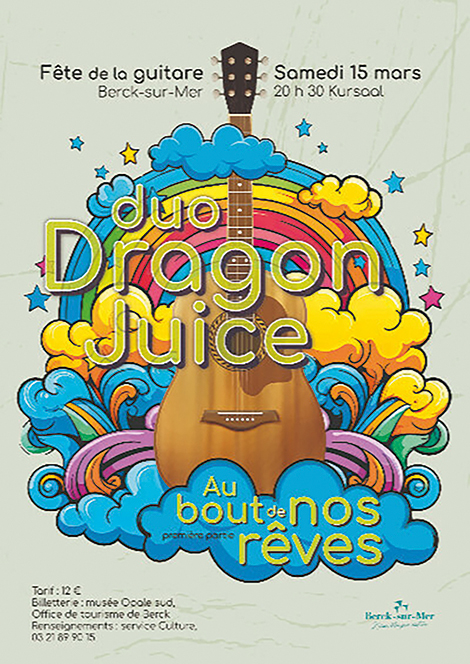Le duo DRAGON JUICE (Marion Mursic et Grégory François) sera à l’affiche du rendez-vous annuel de la guitare. Entre rock, blues, pop et folk, Dragon Juice est un savant mélange de cordes et d’harmonies (le tout saupoudré de paillettes et arrosé de jus de Dragon), avec des reprises des Beatles, Neil Young, David Bowie, entre autres, ou leurs propres compositions.