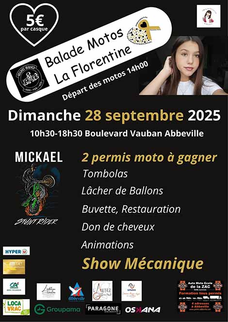 À l’occasion de Septembre en Or, pour sensibiliser aux cancers pédiatriques, l’association Florentine 4Ever reconduit sa manifestation solidaire autour d’un parcours d’une quarantaine de kilomètres, ouvert à tous les types de motos, et d’un village proposant de nombreuses animations installé sur l’esplanade Vauban.