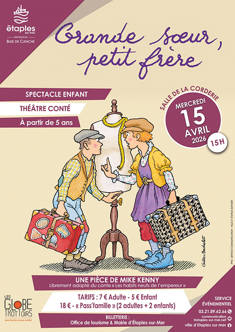 Spectacle enfant. Théâtre conté par la Compagnie « les Globe Trottoirs ». Pièce de Mike Kenny librement adapté du conte « Les Habits neufs de l’empereur » d’Andersen. À partir de 5 ans.