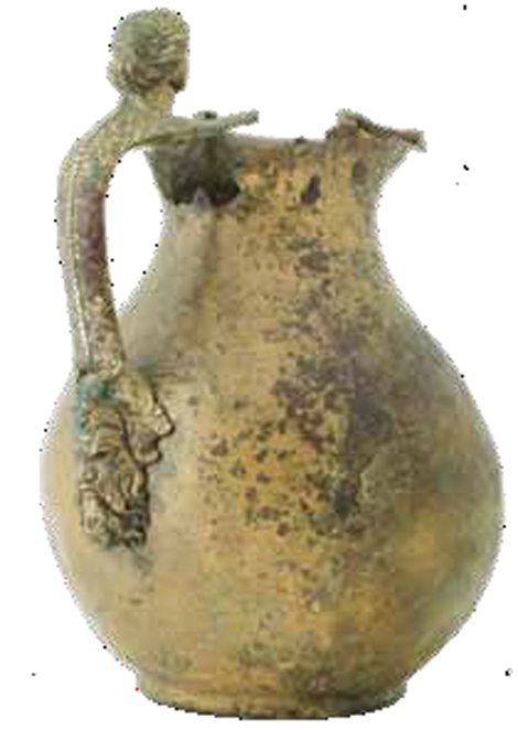 Terninck précise (p.232): “Monsieur Bellon, négociant à Rouen et propriétaire à Saint-Nicolas, s’est associé avec moi pour ces explorations et en a partagé les découvertes“. Ces tombes aristocratiques livrent un riche mobilier, avec de la vaisselle métallique importée d’Italie comme l’oenochoe (cruche pour le service du vin) ci-contre.