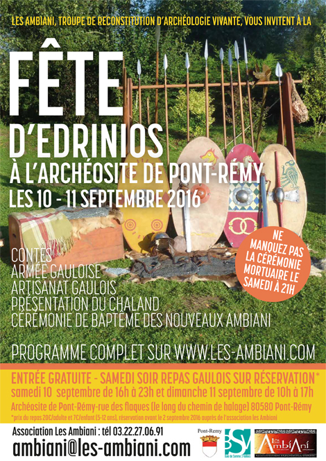 Les Ambiani, troupe de reconstitution d’archéologie vivante, vous accueilleront sur le site d’Arebona qui accueille la restitution d’une maison gauloise, d’une forge, d’une halle et d’un chaland, dénommé Abugnata (fille de la rivière), réplique de l’embarcation retrouvée dans la tourbe à Fontaine-sur-Somme au XIXème siècle.