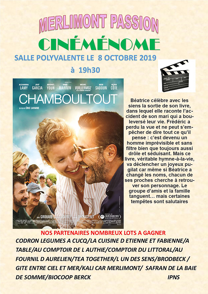 Projection du film CHAMBOULTOUT, proposée par MERLIMONT PASSION. Comédie avec Alexandra Lamy, José Garcia, Mickael Youn. 19h30, Salle polyvalente. Tarif 3€. Infos & réservation : 07 83 02 18 80