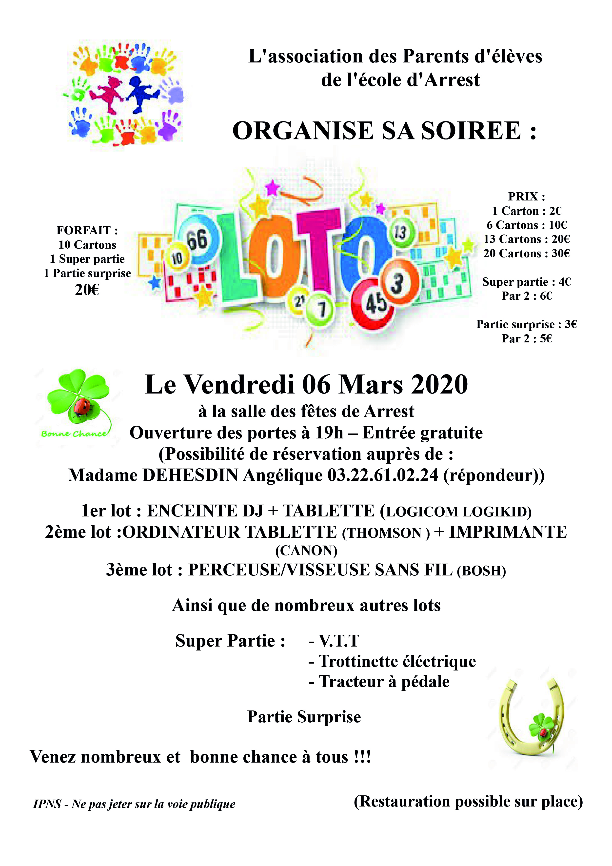 Tarif 2€/carton, 10€/6, 20€/13, 30€/20. 4€/super partie, 6€/2. 3€/partie surprise, 5€/2.
