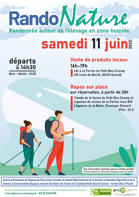 Randonnée autour de l’élevage en zone humide. Un circuit accompagné et commenté de 6 km vous permettra de découvrir l’agriculture, le patrimoine naturel et rencontrer les différents acteurs du territoire. À l’issue de la randonnée, les participants seront accueillis sur la ferme du Petit Bas Champ avec une vente de produits locaux organisée pour l’occasion et accessible à tous à partir de 16h. Un repas vous sera aussi proposé sur place à partir de 20h, sur réservation, tarif 13€/repas.