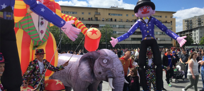 Compagnie Métronome. Les saltimbanques font leur show, parade en musique, clowns géants accompagnés de leur éléphant, et de petits clowns sculpteurs de ballons. Le rendez-vous du rire et de la joie de vivre. Un après-midi inoubliable à partager en famille.